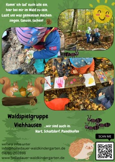 Das Angebot unserer vier Waldspielgruppen Hart, Paindlkofen, Schaltdorf und Viehhausen richtet sich an alle kleinen und großen Naturliebhaber. Wir bieten gemeinsamen Erfahrungsraum für alle die gerne draußen in der Natur die Zeit genießen möchten und sich auch nicht scheuen, bei Regen den Wald zu erkunden und sich auch über den Sprung in die Pfützen freuen können. Die Kinder lernen hier schon im jungen Alter spielerisch den Umgang mit Tieren und Pflanzen, genießen die wertvolle Zeit in der Natur, lernen die Veränderungen in den verschiedenen Jahreszeiten kennen und können zusammen mit anderen Kindern kleine Abenteuer im Wald erleben. Die Waldspielgruppe ist für Eltern mit Kindern im Alter von 1 bis 3 Jahren ausgelegt. Wir treffen uns einmal in der Woche und verbringen gemeinsam Zeit im Wald. Unsere Treffen haben einen strukturierten wiederkehrenden Ablauf. Gerade in dieser Altersstufe ist es wichtig für die Kinder, Sicherheit in festen Abläufen und Ritualen zu finden.